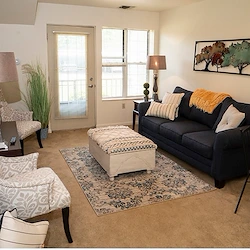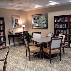 Some favorite gathering spots in our senior community include our lobby with skylights, lounge with a fireplace, and courtyard benches. We sit on 23 acres of land, and our walking path encircles the entire community.